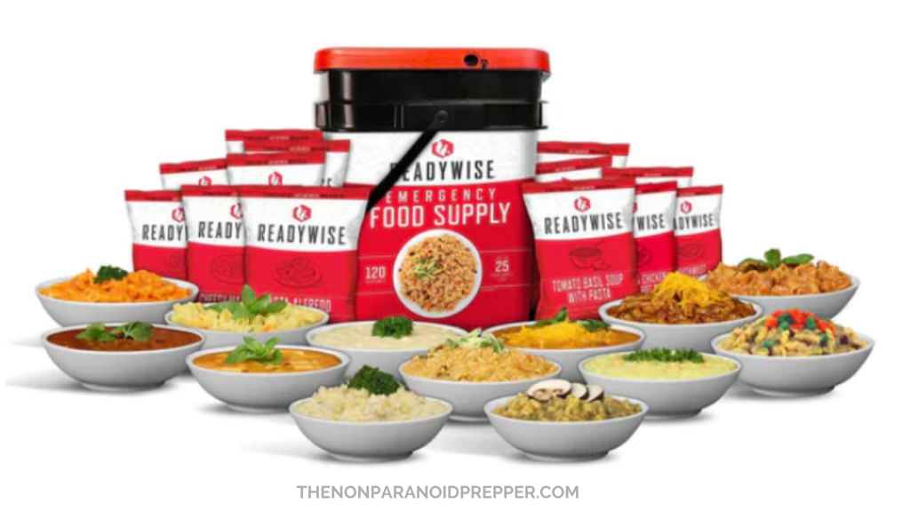 Try this 120-meal freeze-dried emergency food bucket. Made in the USA.